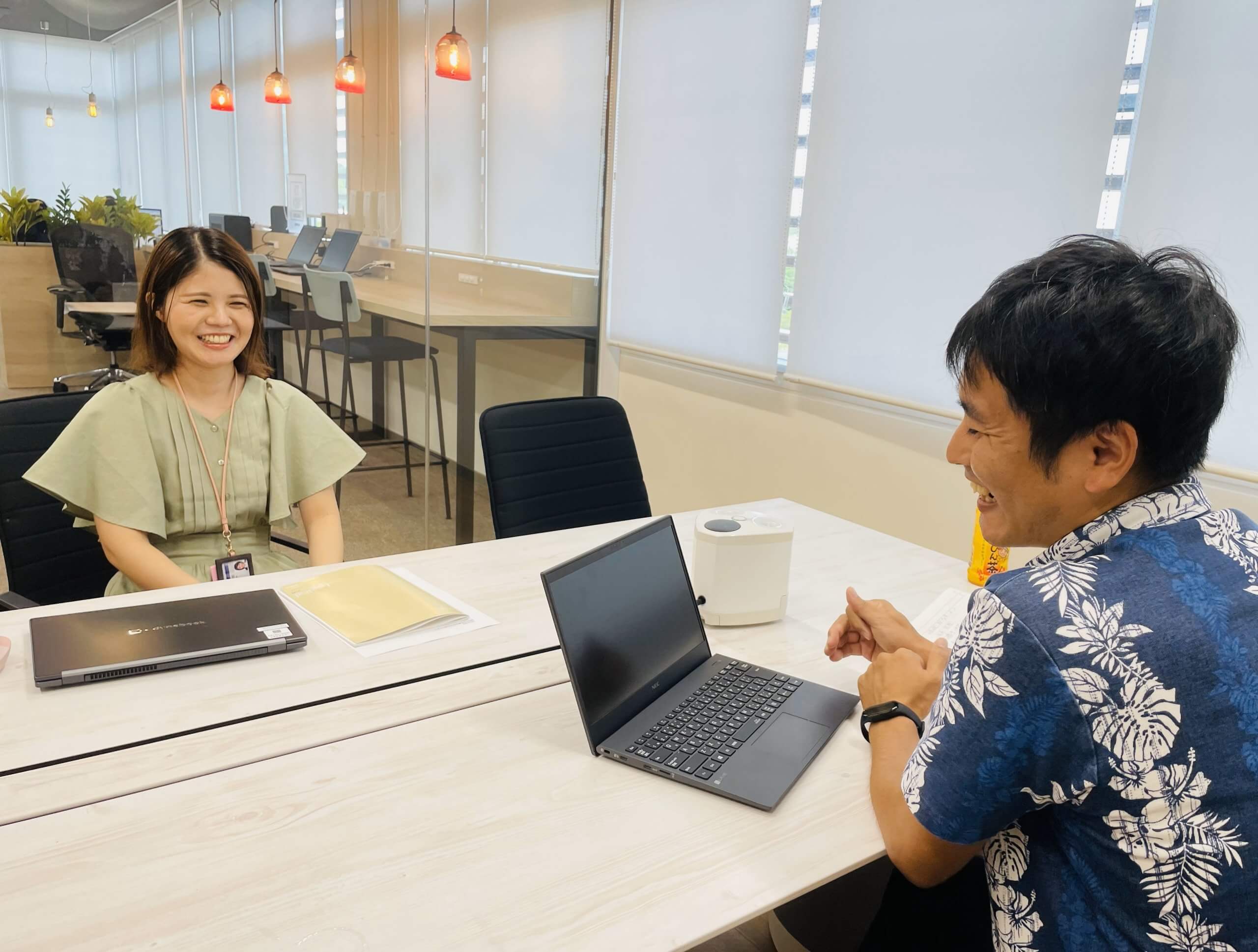 前職時代に独学で始めたデータ分析の面白さと可能性に気づき、「安定よりも大切なことがある」と転職を決意した大城さん。彼女の転職活動に伴走した株式会社レキサンの玉城良樹コンサルタントが同社を訪れ、これまでの歩みやキャリアへの向き合い方について語り合いました。