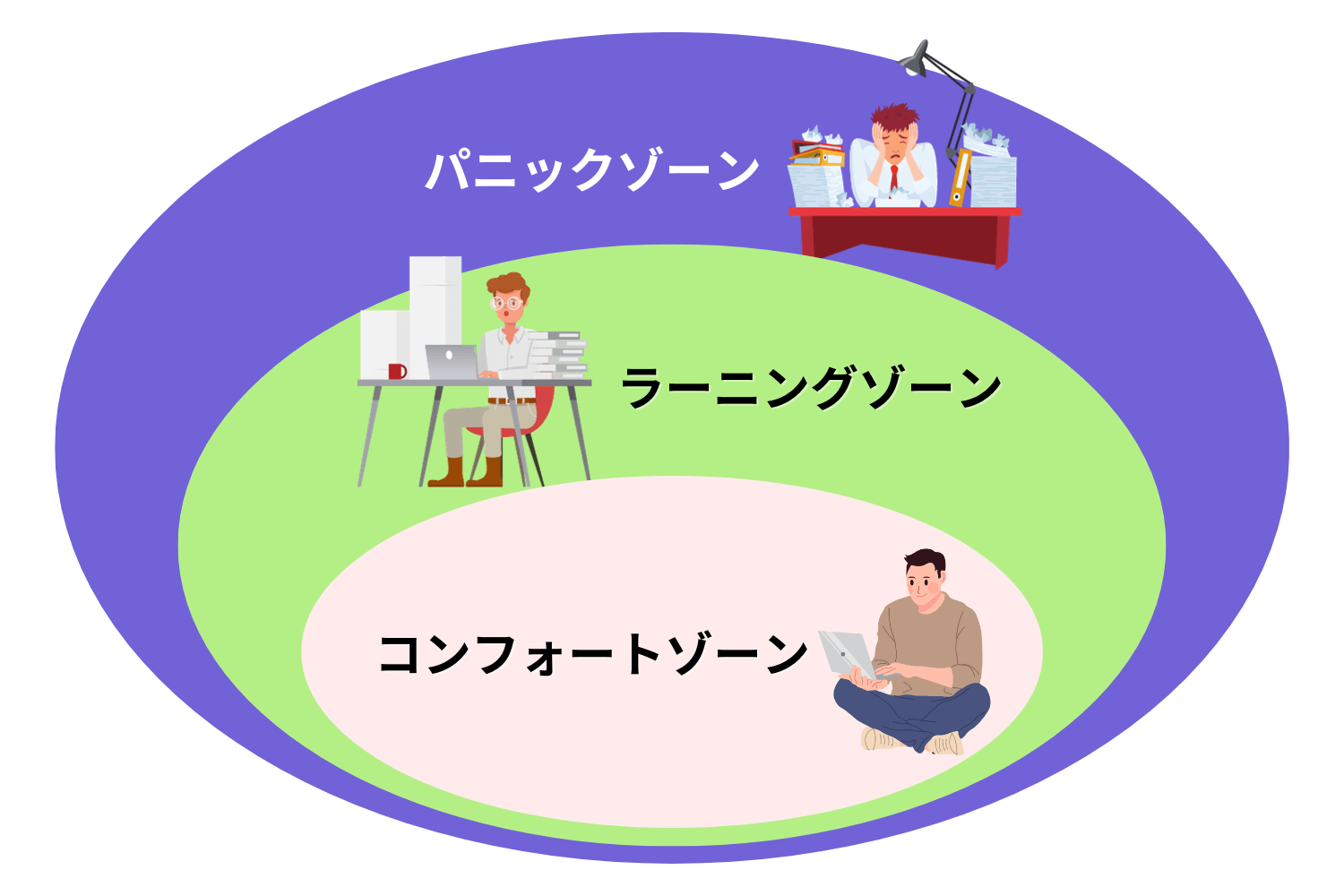 コンフォートゾーンが最もストレスも刺激も少ない状態で、ラーニングゾーンは適度にストレスや刺激があり、パニックゾーンはストレスが過度になってしまい心身に不調をきたすレベルの状態です。