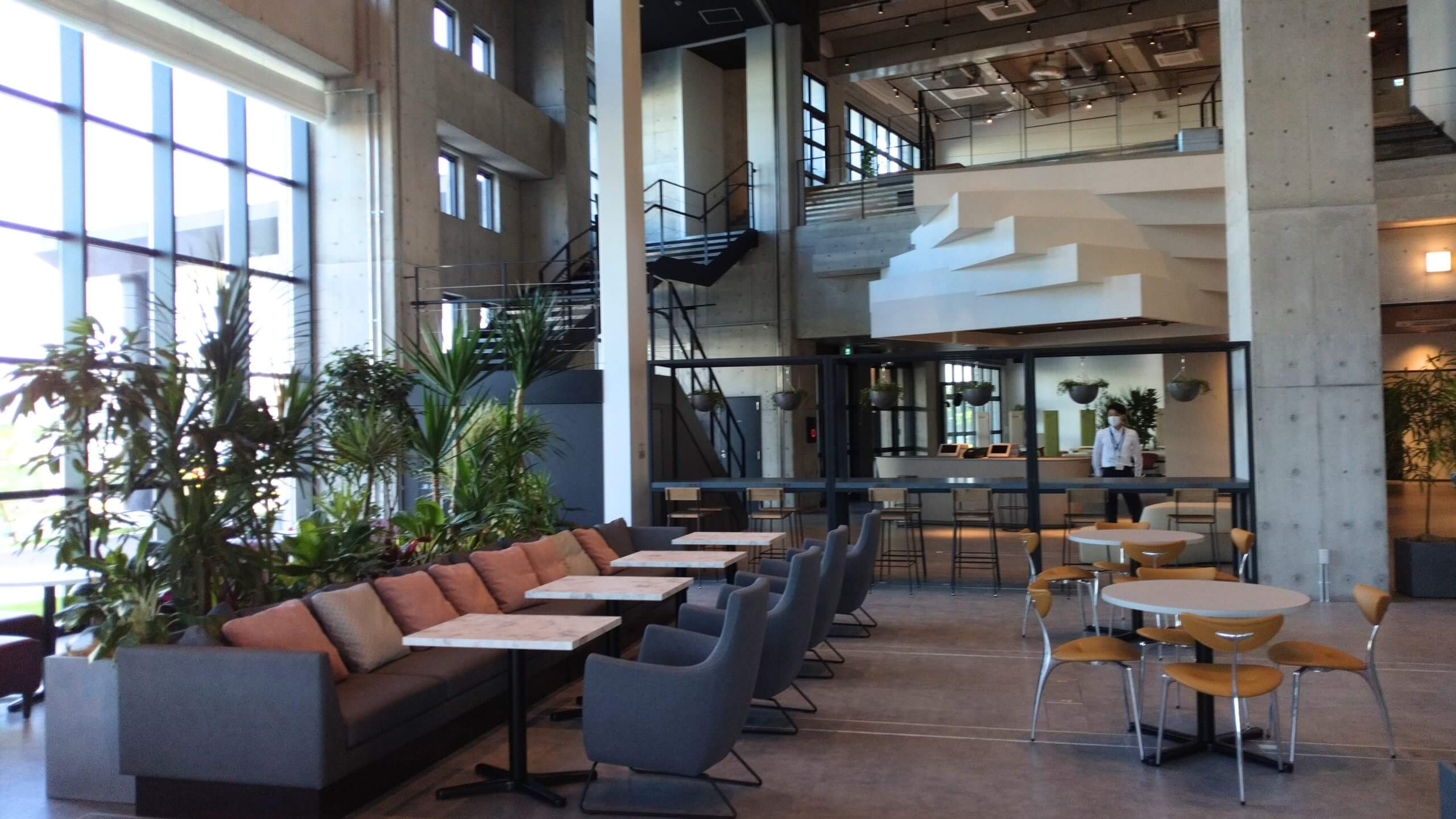 正面玄関を入ると、オープンスペースやレストランとして稼働予定のティーホールがあり、ここではロボットでの配膳等を活用して省力化の実験を行う予定です。
